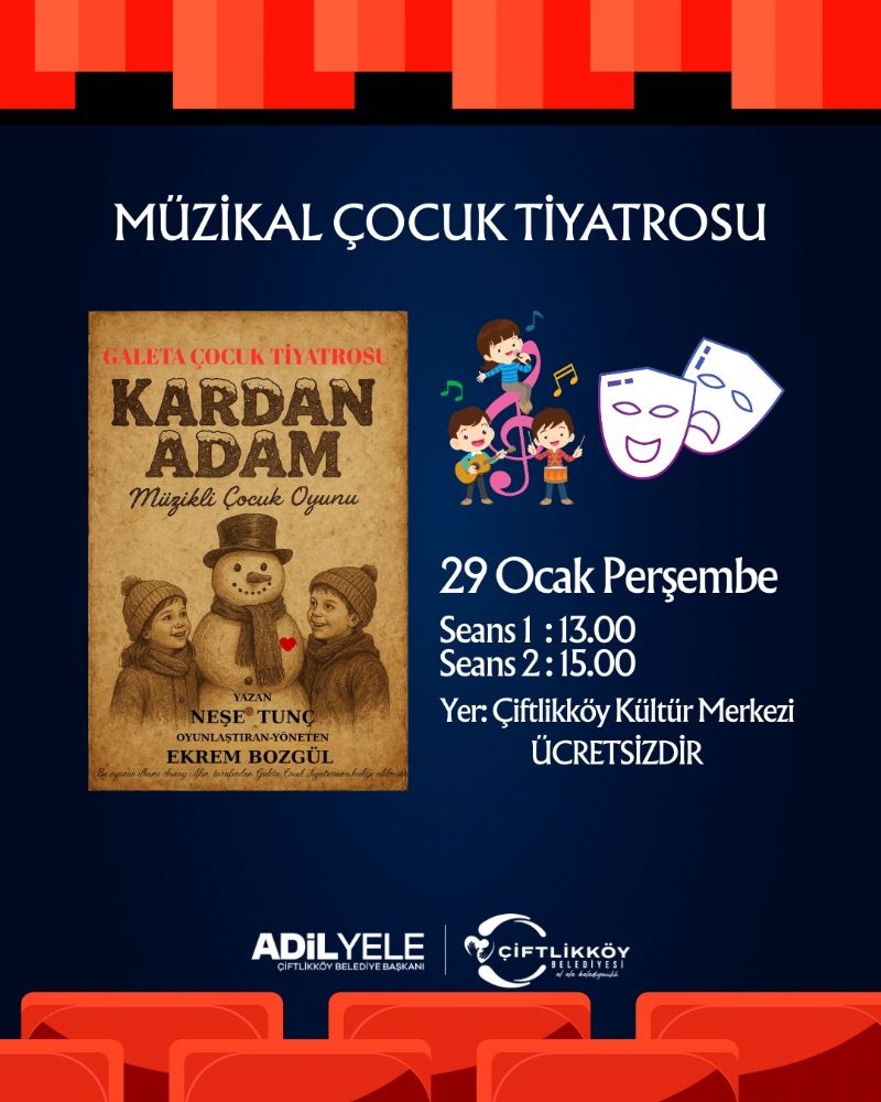 Çiftlikköy Belediyesi, çocuklarýn hayal gücünü besleyen, eðlendirirken düþündüren tiyatro etkinlikleriyle minik sanatseverleri kültür ve sanatla buluþturuyor. “Þirinler”, “Canýmýz Can Olsun” ve “Kardan Adam” adlý müzikal çocuk tiyatrolarý; dostluk, doða sevgisi, paylaþma ve umut gibi evrensel deðerleri sahneye taþýyarak çocuklara unutulmaz bir tiyatro deneyimi sunacak.